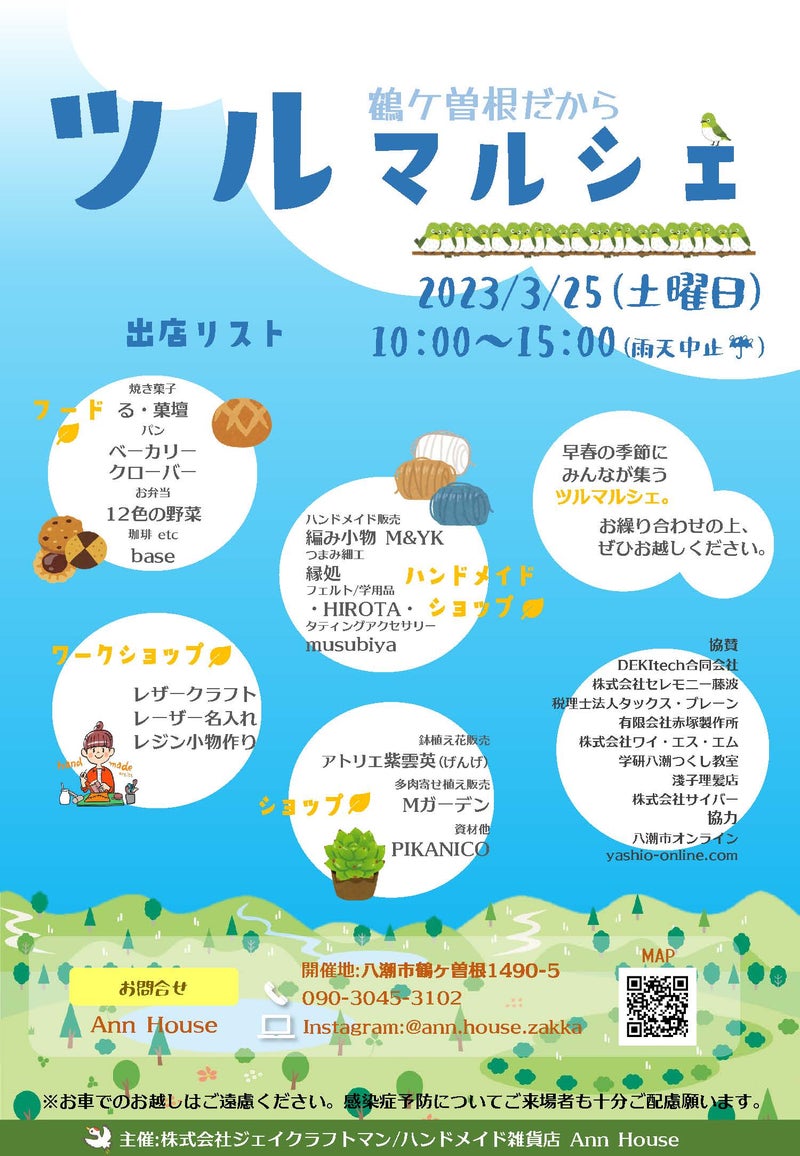 来たる3月25日(土)、八潮市鶴ケ曽根にあります、ハンドメイド雑貨のann houseさんと、皮革製品、袋物の企画・製造のジェイクラフトマンさん主催のマルシェ「ツルマルシェ」が開催されます。